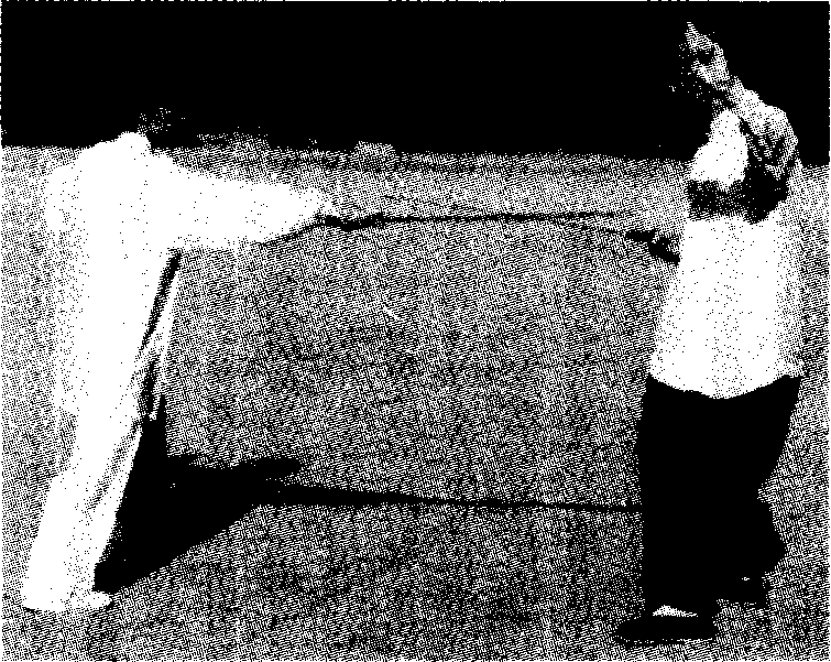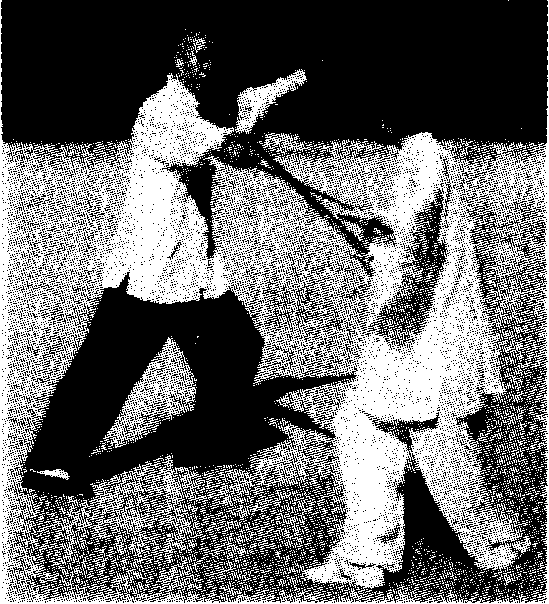 4. 乙左足向左侧进一步,身向右转,面向甲,成左 侧弓步。同时,右手剑向里翻,正手用内剑脊压甲剑, 伸臂平剑扎甲胸腹。甲右足向左横一步;右手剑顺势 向外翻,向右侧引带,使乙剑滑脱,扎空。(图五19)