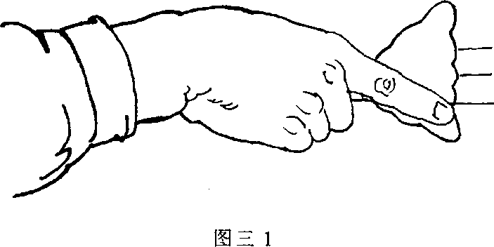 剑是身外之物,通过手握剑柄,把它与全身连接起 来。剑的活动,使招、发劲,全靠手握剑柄操纵。可见,正确 的握剑方法十分重要。有些教师,把一些错误的握剑方法 教授学生,实乃误人子弟。最常见的错误握剑方法是把食 指伸出放在剑的护手上(图三1)。这完全违反剑法的技击