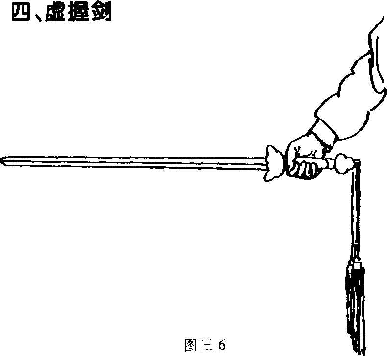 当用剑击中对方身体时,如劈、刺、剪、撩等,或防守 拨、压、崩、挂对方剑器时,要满把实握剑,即五指握实剑柄 以增加剑的力量。(图三5)在剑没有接触对方身体或碰撞对方剑器时,剑不要 握得太死,掌心与剑柄有一定的空隙。(图三6)