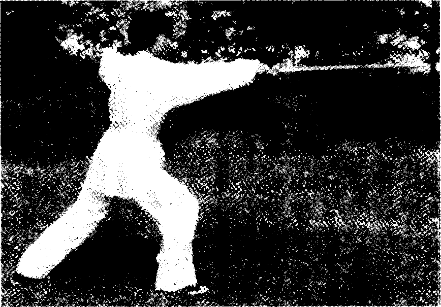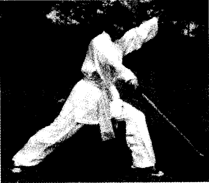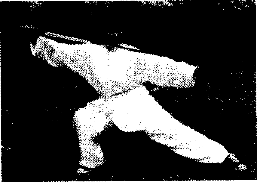 1?弓步(1) 正弓步图三21甲前足全脚掌着地,脚尖朝前,屈膝前弓;后腿自然伸 直,脚尖外撇45。;两脚跟横向相距约一至二拳宽。(图三 21甲)图三21乙(2)斜弓步惟两脚的站位在正方形的对角上而身向前方,其余 要求与正弓步相同。(图三21乙)(3)侧弓步身向前方,两足在身之两侧;一腿弓向一侧,另一腿 向另一侧伸出,自然伸直;弓腿之脚尖外展45。,另一脚脚 尖向里扣。(图三21丙)