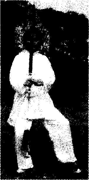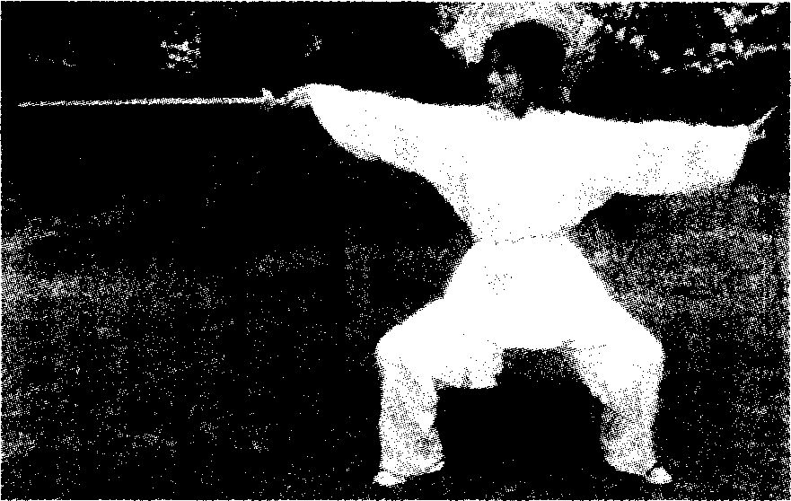 身向前方,两足向体侧横开一步,八字脚,半蹲;圆裆 开胯,上身直立中正。(图三23)