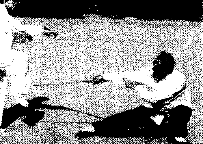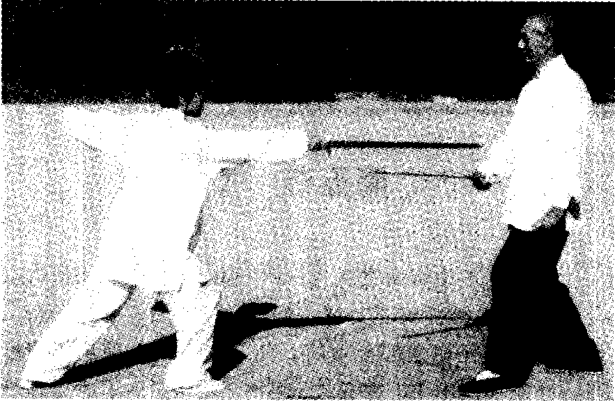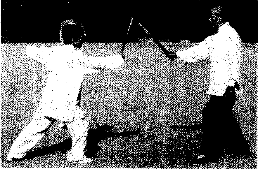 甲乙右手持剑对峙。乙侧弓步,下势,右手剑以下刃 砍甲右腿。甲急提右腿,右手剑以下刃截乙持剑之手腕 (图三105).