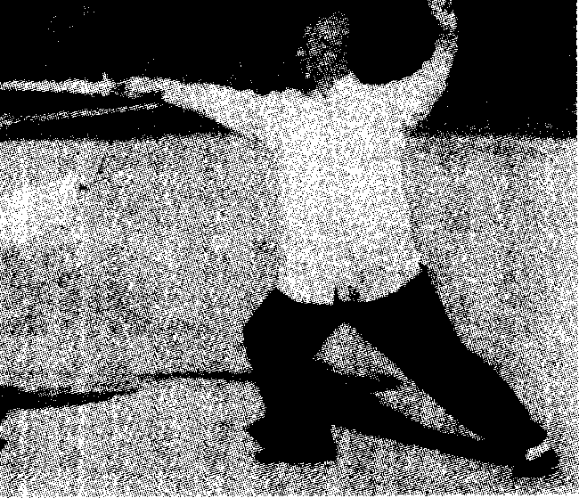 甲乙右手持剑对峙。甲仆步下势,伸右臂,右手 剑以下刃平扫乙右小腿°乙急提右腿,避开甲扫来 之剑,顺势右手外翻,反手用剑上刃截甲持剑之手 腕。(图三106)