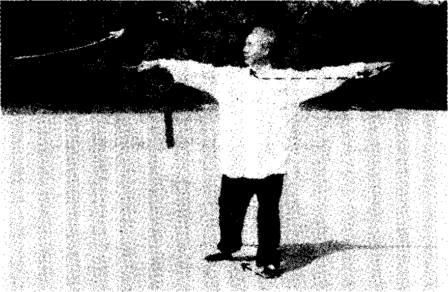 图四16姿势说明:左足向前上半步,弓膝成左弓步。同时,剑交右手,由 左而前向右平扫,剑面平,剑身水平,剑锋向右方,手背朝 上;左手成剑指,向左平展,掌心向下,指向左方。面向右 方,目视锋剑方向。(图四16)应用说明:敌用剑由右方刺我右肋;我向前上步,避开敌剑,平 扫敌头。