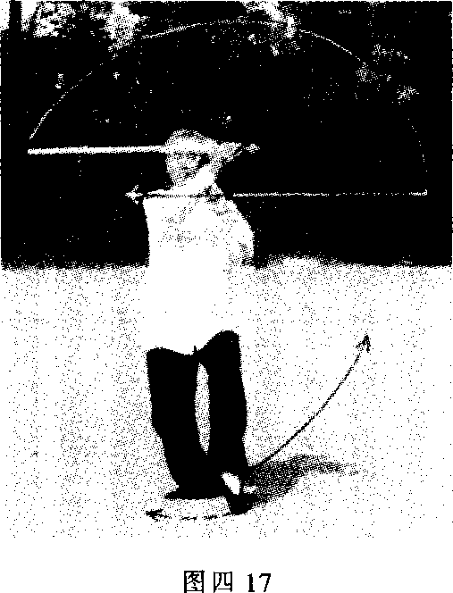 姿势说明:身向后坐,坐右足,左足向后撤半步,脚尖点 地。同时,右手持剑由右方向左前方回挂,手心向内; 竖剑面,平剑身,横于面前,剑锋向右方;左手剑指抚 右腕以助其势。面向前方,目前视。(图四17)应用说明:挂剑势属挂法,应用都是侧挂。敌从正前方用剑 刺我头部;我举剑用剑身根部无刃段格彼剑,再身向 左转,剑亦随之向左带,将敌剑挂出。
