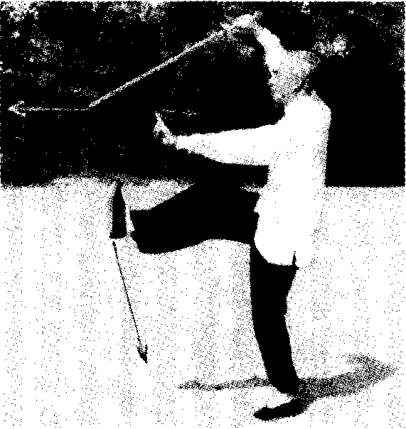 姿势说明:右脚微提,向外撇,横脚落地;左脚绕右脚跟, 落于右脚左侧,身随之向右后转180%然后,左足 立起,提右足,右腿微屈,勾脚尖,成独立势。同时, 右手持剑向里翻,上提,剑柄举于右额上侧;下刃 朝上,上刃向下,剑锋向前下方;左手剑指循剑上 刃指向剑锋。目视剑指方向。(图四31)应用说明:敌用剑自身后刺来。我翻身避开敌剑,起脚踢 敌持剑之手腕,顺势提剑以观其变。