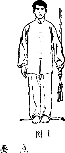 两脚并拢,脚尖朝前;畅胸舒背;身体直立,两臂自然 垂于身体两侧,右手成剑指,手心朝里5左手持剑,手心朝 后;剑身竖直贴靠在左臂后面,剑尖朝上;目视前方《图Do