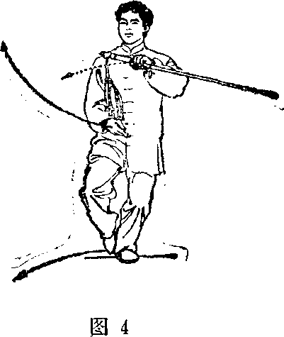 3。右脚向右前方(约45。)上步,随身体重心前移成右 弓步;同时右手剑指经左臂下向前上方摆举,臂微屈,腕同 肩高,手心斜朝上;左手持剑附于右前臂内侧(剑柄在右前 臂上方),手心朝下;继而,身体重心移向右腿,左脚跟至右脚 内侧后方,脚尖点地;同时右手剑指向右前方伸送;左手持剑 屈肘置于右胸前,手心朝下多目视剑指方向(图5、6) o