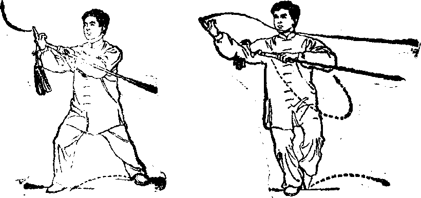 2.两臂自然伸直向左前方摆举至与肩平,手心朝下号上 体略右转,随转体右手剑指右摆,至右前方后屈肘向下划弧至 腹前,手心朝上;左手持剑,右摆后屈肘置于体前,腕同肩
