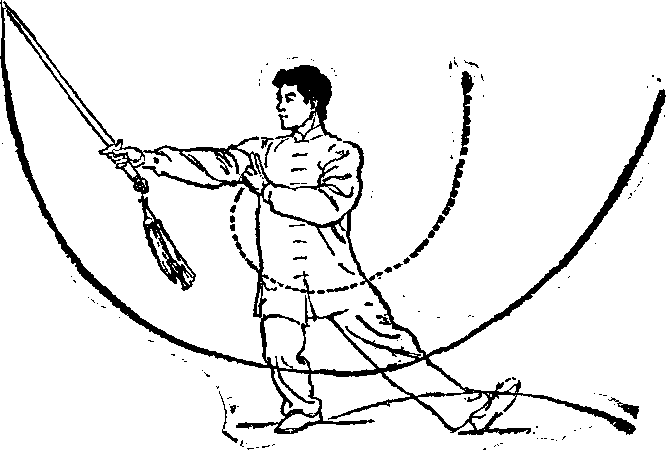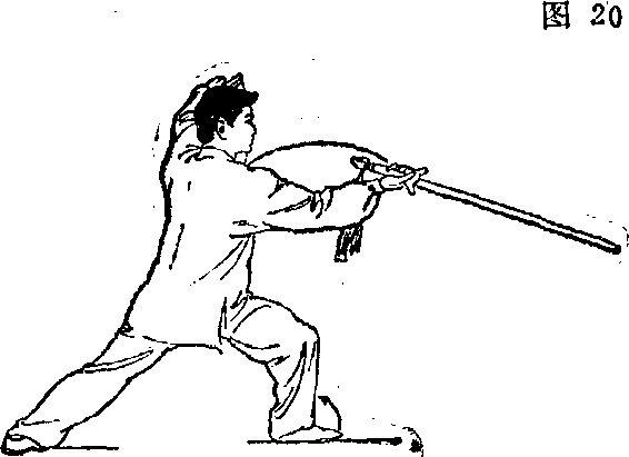 剑尖斜向下;左手剑指向下、向左上方划弧,臂呈弧形举于 头上方,手心斜朝上,目视剑尖方向(图21) o