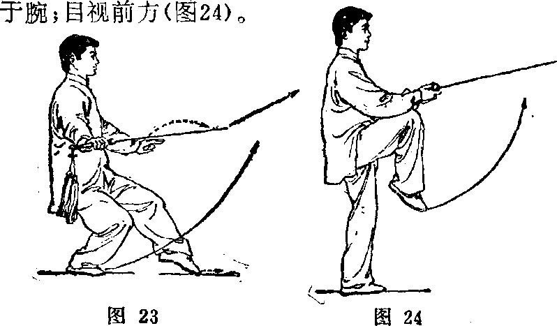 1?左腿屈膝半蹲,重心 后移,身体略向左转多同时 右手握剑随转体向左平带, 手心朝上,腕同胸高,剑尖 朝前;左手剑指屈肘下落附 于右腕部,手心朝下;目视 剑尖方向(图22) 0