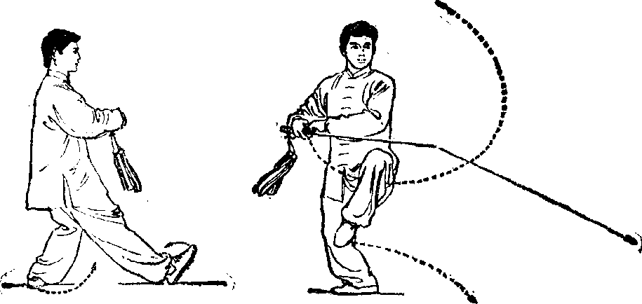 * 3?左脚向前活步,随重心前移,左腿自然直立,右腿屈膝 提起成左独立步;同时两手手心翻转朝上随提膝由两侧向胸 前相合.,左手剑指捧托在右手背下,与胸同高;剑尖朝前,略高