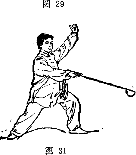 3 ?左脚向左前方落步 成左弓步丁同时右手握剑 向左前下方平剑刺出,手 心朝上;左手剑指向左、 向上划弧,臂呈弧形举于 头前上方,手心斜朝匕 目视剑尖方向(图31)。