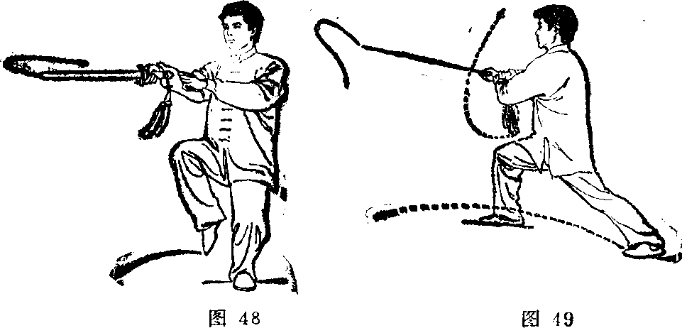 1?左膝微屈,右腿屈膝提起,脚尖下垂;同时右手握剑 立刃向前伸送至与胸高,臂自然伸直,剑尖略低于手;左手 剑指经上向前附于右前臂内侧;继而,右脚向右前方落步, 上体略右转成右弓步;同时右手握剑前伸,手心转向下后屈 肘向右带剑至右肋前,剑尖朝前左手剑指仍附于右前臂内 侧;目视剑尖(图48、49)。