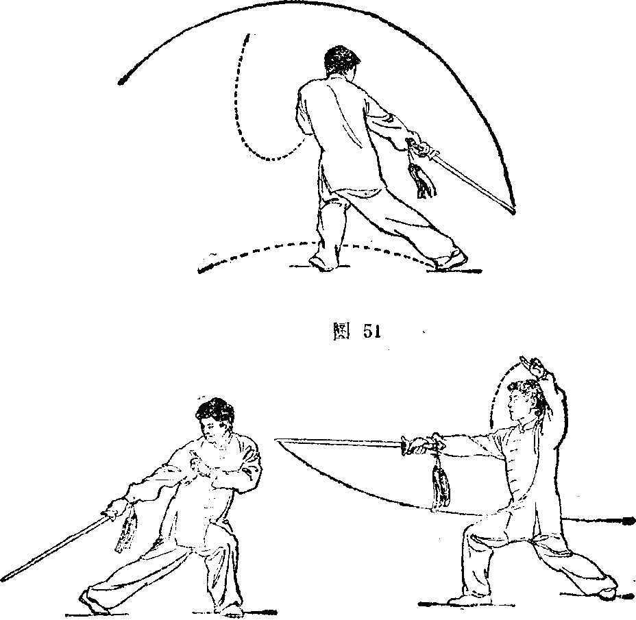 1 .随重心前移,右脚摆步向前,屈膝半蹲,左腿自然伸 直,脚跟提起,上体右转;同时右手握剑向右后方下截;左 手储指屈肘向下附于右肩前,手心斜朝下;目视剑尖(图 51. 51 附)。