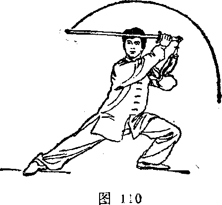 1 .身体重心后移,上体左转$左脚尖外摆,凰膝半蹲, 右腿自然伸直;同时右手握剑,以剑柄领先,屈臂外旋,向 左上方带剑(距头部约20厘米),手心朝内,剑尖朝右;左 手剑指附于前臂内侧,手心朝外手目视剑尖《图110》。