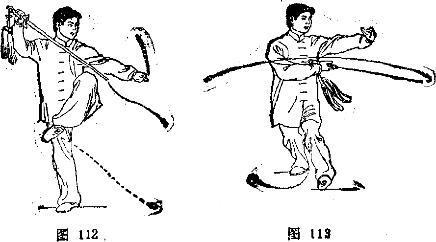 3?左腿屈膝提起成右独立步;上体略右转并稍前倾;同 时右手握剑,剑柄领先,向右、向上划弧提到,臂呈弧形举 于右前方,腕同额高,虎口斜朝下,剑尖置于左膝外侧;左 手剑指经腹前向左划弧摆举,与腰同高,手心朝外,目视左 前下方(图112) o