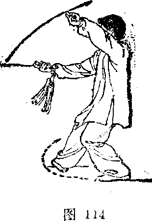 2?随身体重心前移,左脚踏实,膝微屈,右脚向右摆 步上体右转;同时右手握剑,剑尖领先,向前、向右划弧 穿剑,腕与胸同高,剑尖朝右;左手剑指经胸前向左分展侧 举,臂呈弧形,手心朝外;目视剑尖(图114);