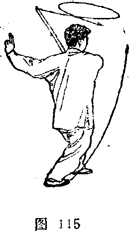 3?随身体重心前移,左脚向右扣步,上体略右转;两手 动作不变(图115) 0依次右、左脚再各上一步。