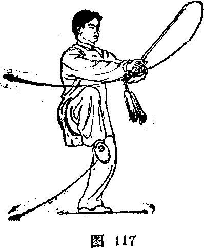 1?右手握剑,前臂内旋经面前使剑尖在头前方逆时针划 弧,屈肘向左摆至左肋前,剑尖朝左上方;当右手握剑左摆 至面前时,右脚外摆腿,下落至水平时屈收小腿;左手剑指向 上,在面前与右手相合,屈豺附于右腕内侧,手心朝下;目 视前方(图116、117) o