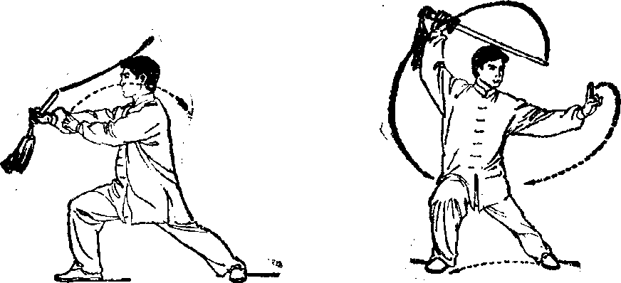 2 .身体重心右移,右腿屈膝,左腿自然伸直,左脚跟外 转,上体略右转$同时右手握剑方剑柄领先,前臂内旋,手