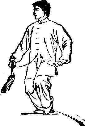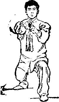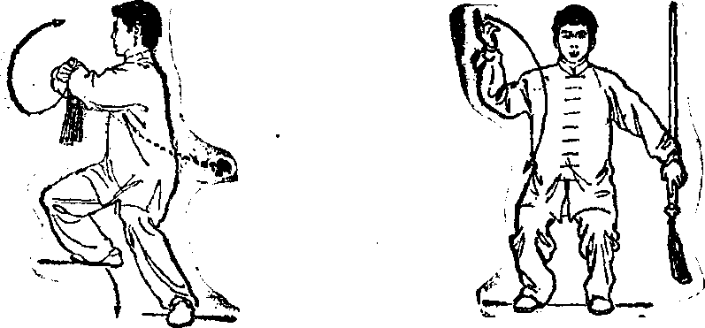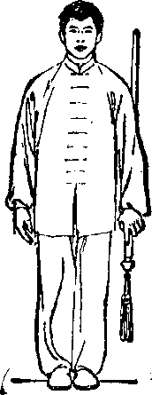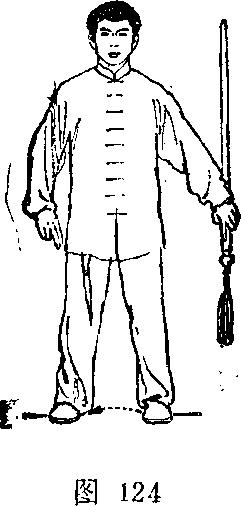 3.两腿自然伸直;同时右手剑指经胸前向下落于身体右 侧;然后左脚向右脚并拢,身体自然站立,两臂垂于体侧孑 目视前方(图124、125) “、