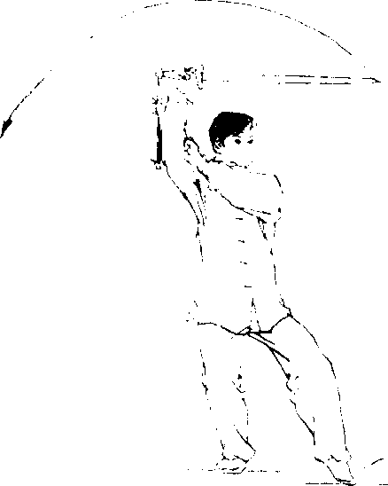 2. 身体右转,右脚尖外展,随 重心前移落地踏实,右腿屈膝半 蹲,左脚向左前方上步成左虚步; 同时右手握剑,剑刃领先经后向 下、向左前上方立圆撩架至头前上 方?臂微屈,手心朝外,剑尖略彳氐于 手;左手剑指附于右腕部;目视左 前方。(图19)