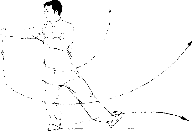 L右腿屈膝,重心稍后移,左 脚尖翘起并稍外展,上体左转;继 而,随重心前移左脚落地踏实,上 体略右转,右脚向右前方上步,脚 跟着地;同时右手握剑随转体屈肘 向上、向左划弧至左胯旁,手心朝 里,剑尖斜朝后上方;左手剑指下 落附于右腕部;目视剑尖方向。(图 18)