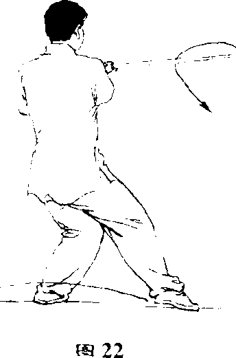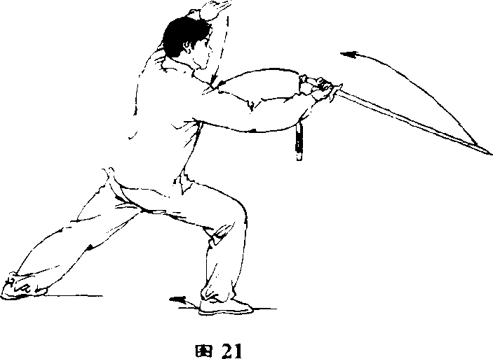 向下;左手剑指向下、向左上方划 弧,臂呈弧形举于头上方,手心斜 朝上;目视剑尖方向。(图21)