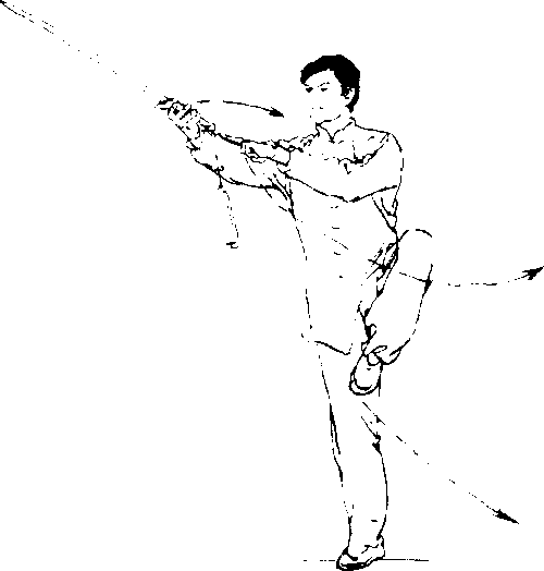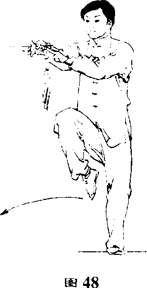 提膝与刺剑要协调一致。提膝 不得低于腰部,上体要保持端正自 然。