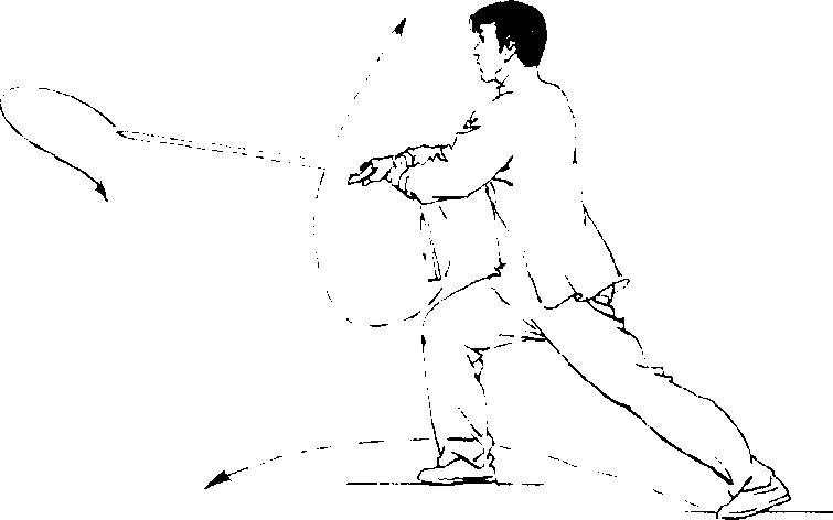 右前臂内侧;继而,右脚向右前方 落步,上体略右转成右弓步;同时 右手握剑前伸,手心转向下之后屈 肘向右带剑至右肋前,剑尖朝前; 左手剑指仍附于右前臂内侧;目视 剑尖。(图48s49)