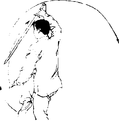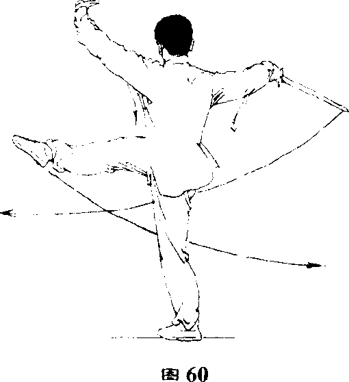 5. 右脚向前摆踢成分脚;同时 上体略向石拧转,随转体右手握剑 经上向右后方点剑,腕同肩高;左 手剑指向左上方摆举,臂呈弧形举 于头上方,手心斜朝上;目视剑 尖。(图60)