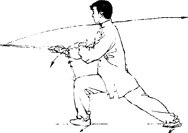 侧立圆划弧至后下方时,以剑柄领 先,前臂内旋上提举至头前上方, 手心朝石,剑尖朝前下方;左手剑 指夕卜旋,向前下方伸出至右脚踝内 侧前方,手心朝前上方;目视剑尖 方向。(图59)