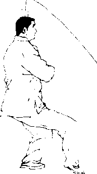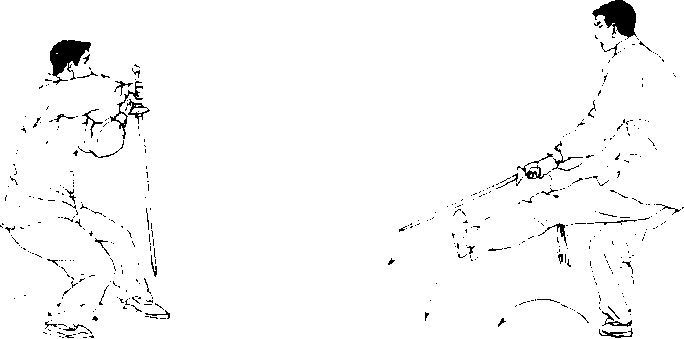 【意 气】意想左胯、左膝松力,身体下降。右脚向右后上步 吸气,刺剑呼气。