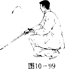 右脚蹬地,两脚腾前跃,落地成歇步状,左腿在前,同时,右手 持剑,左手按于右腕,向下点剑,目视前下方。(图10-99)