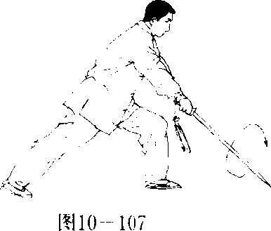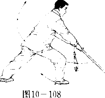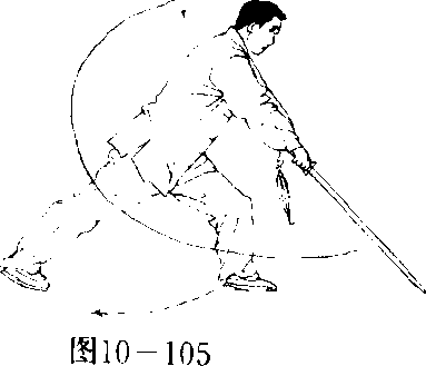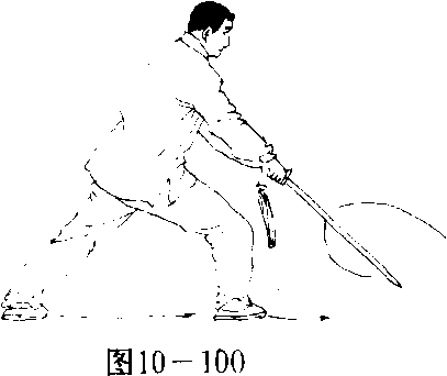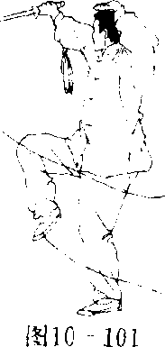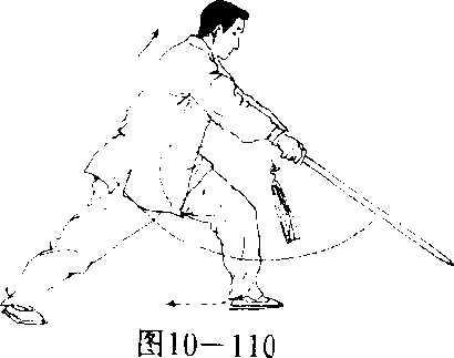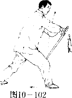 重心在左脚,右脚经左脚向左后上步,重心移向右腿,成右弓 步,同时,右手持剑向下向右向体内方向下刺佐剑指按于右腕,目 视剑尖。(图10—101)