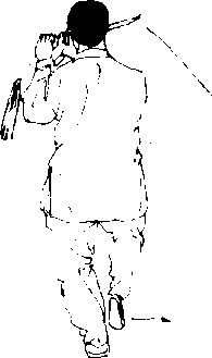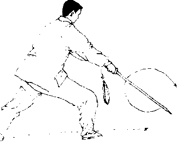 【意 气】挑剑时沉肩垂肘,继续呼气。