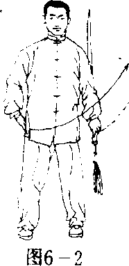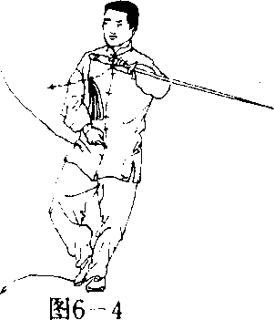 ⑵收脚抱臂 网臂自然伸直向左前方摆举至与肩平,手心 朝下;上体略右转,随转体右手剑指右摆,至右前方后屈肘向下划 弧至腹前,手心朝上;左手持剑,右摆后屈肘置于体前,腕同肩高, 手心朝下;两手心相对,同时重心左移,左腿屈膝半蹲,右脚收提至 左脚内侧(脚不触地);目视右前方。(图6—3、图6-4)