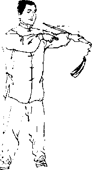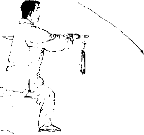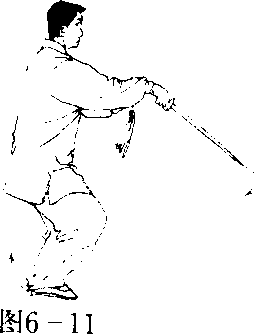 (3) 并步点剑 身体重心前移,右脚向左脚并步,屈膝半蹲; 同时右手接握剑柄,随以腕关节为轴,使剑尖由身体左后方经上向 前划弧,至腕与胸高时,提腕使剑尖向前下方点剑;左手变剑指附 于右腕内侧;目视剑尖方向。(图6-11)