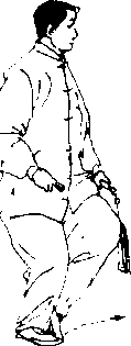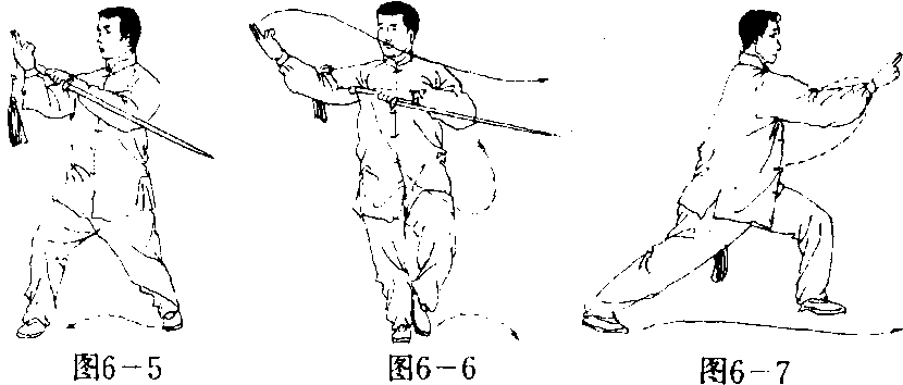 【意 气】(1)意想左胯气下沉收住胯,屈右胯,大、小腿依次 带动上提,然后,脚、小腿、大腿反序落下。同样的方法收左脚,气 沉右脚底,双手意想与收脚似一气相牵落下,上右脚吸气,收左脚 呼气。(2)意想裆走下弧上步吸气,成弓步时,呼气。(3)意想劲由 后脚上传于右手,松肩接剑,吸气,点剑与收脚并步同时,呼气。