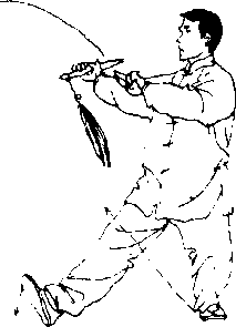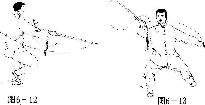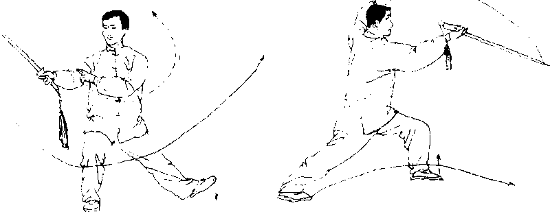 【意 气】(1)意想剑走圆弧,劲不断,松右侧身体,转腰收 剑,吸气。(2)意想右胯松沉,转腰带剑,劲贯剑刃由下向上撩出, 呼气。