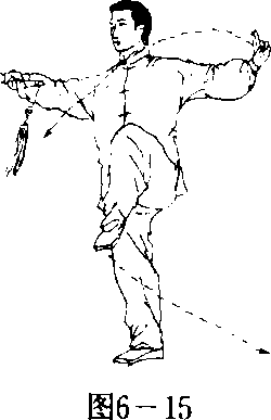 (2) 提膝劈剑 身体略向左转,重心前移,右脚掌踏实,左腿 自然直立;左腿屈膝提起成右独立势;同时右手握剑向前劈出,剑、 臂平直;左手剑指经下向左划弧摆举至与肩平,手心朝外,指尖朝 前;目视剑尖。(图6-15)