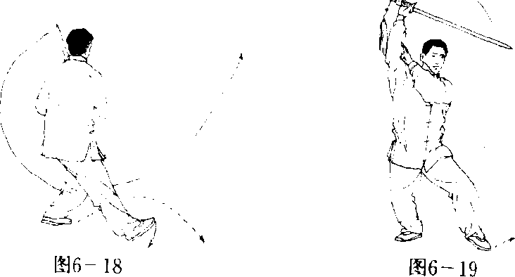 (1) 转体收剑 右腿屈膝,重心稍后移,左脚尖翘起并稍外 展,上体左转;继而,随重心前移左脚落地踏实,上体略右转,右脚 向右前方上步,脚跟着地;同时右手握剑随转体屈肘向上,向左划 弧至左胯旁,手心朝里,剑尖斜朝后上方;左手剑指下落附于右腕 部;目视剑尖方向。(图6-18)