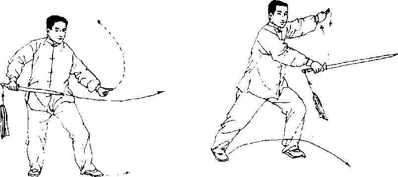 【意气】意想右腿膝、踝、胯向下松沉,松腰转体,裆走下 弧,右脚蹬地力透三关,劲贯剑尖,左脚落地时吸气,刺剑呼气。