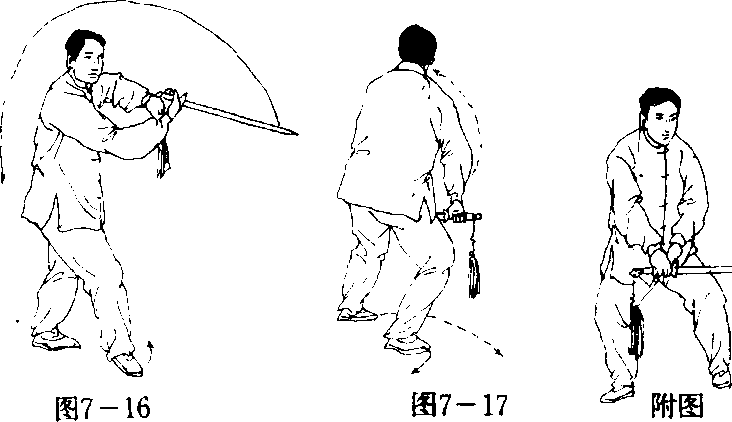 (2) 骗马护膝 右脚尖里扣,重心偏移右腿,身体向左转体 (面向北)成骗马步;右手剑与左剑指随转体的同时,由前向后、向 下立圆划弧劈下,剑身平直护于左膝前,右手心朝体,左手心向下; 力达剑刃;目视剑身。(图7-17)