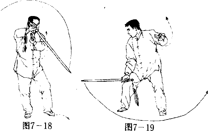 (4) 骗马护膝 左脚向左侧略上步,重心偏移左腿成骗马 步洞时上体随左脚上步略向右转体,右手持剑由上向右、向下立 圆划弧劈下,剑身平直护于右膝前,手心向外;左剑指经腹前向下、 向上绕行,停于左侧上方,手心斜向下;目视剑身。(图7-19)
