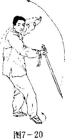 (2) 转体举剑 身体向左后方向转体180度(西北)(右脚掌 碾地配合转体),在转体的同时右手持剑屈臂收于腹前,手心向体, 剑尖斜向右上方;左剑指随即附于右腕部,手心向外。(图7-21)