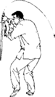 【意 气】意想松左胯跟身体左转,回身点剑,劲贯剑尖,吸 气;提剑时意想腰脊为中轴,用腰带臂缠绕提剑,吸气。