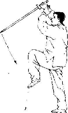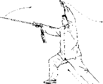 【意 气】意想气在腹部鼓荡,带动身体的前后重心潜换,劈 剑要利用全身之力,贯于剑刃。