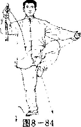 (1)提膝举剑 重心后移,扣右脚,左转腰,落实右脚,提左 脚成独立势,同时,右腕钳把,掌心向上举剑于右肩上方,左剑指下 按至左膝下,R视前方,(图8—84)